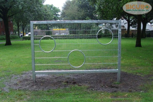 Oefenwand Metaal is een voetbaldoel met stevig opvangnet, voorzien van 3 richtgaten voor het trainen van het richtingsgevoel. Het toestel is hufterproof, ideaal voor een trap- of voetbalveldje op een speelplek of voor in de openbare ruimte. Leverbaar in de kleuren verzinkt, wit, groen, blauw, zwart en oranje. Overige kleuren in overleg.