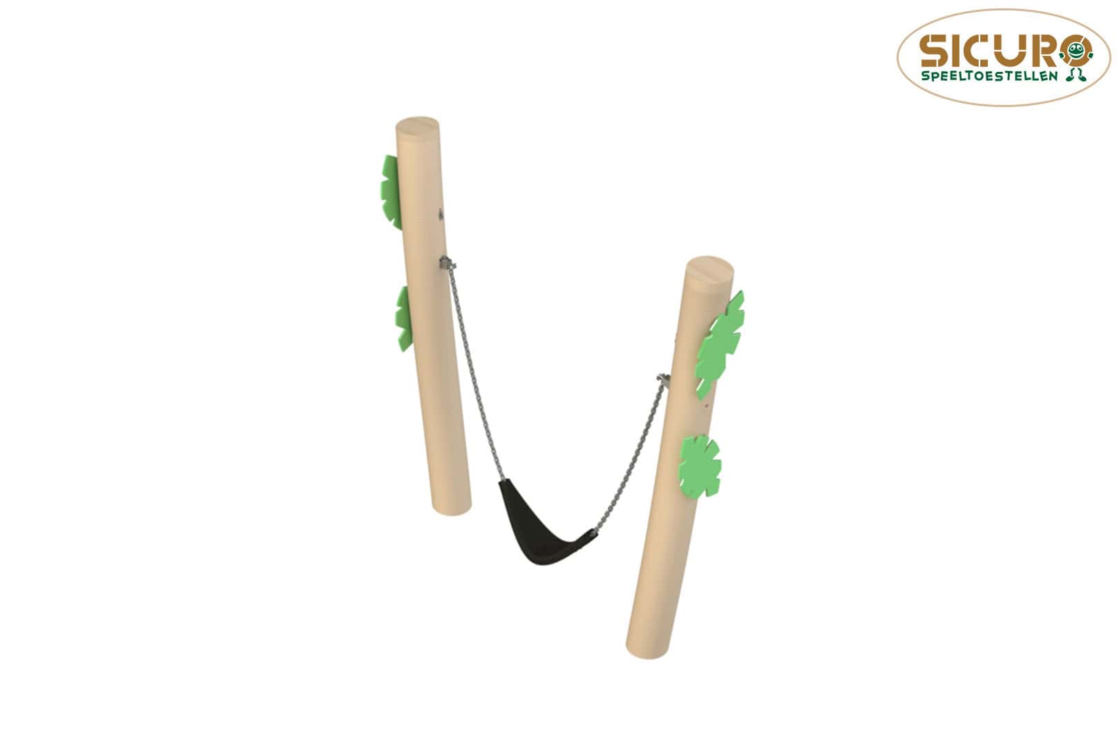 Peuterschommel Philo, voorzien van flexibel peuterzitje bevestigd op 130cm hoogte en gedecoreerd met bladeren. Een eenvoudig toestel waarop de jongere kinderen veel plezier beleven. Erg geschikt voor speelplekken met minder beschikbare ruimte. Ook in niet gedecoreerde uitvoering leverbaar.